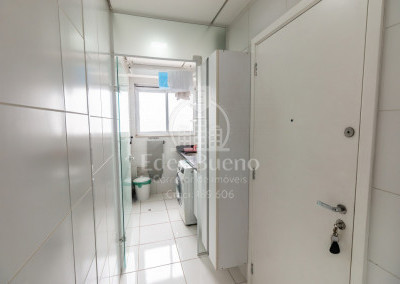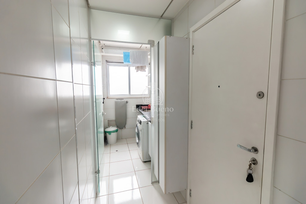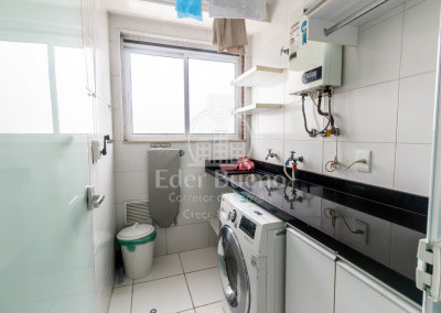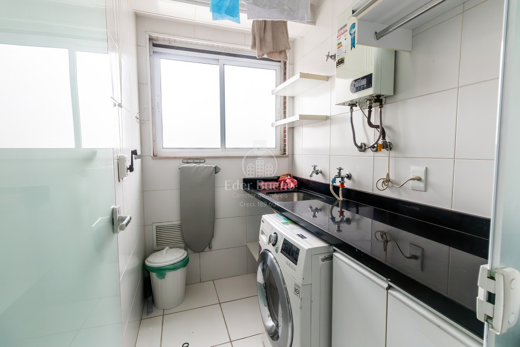 A área de serviço é equipada com um aquecedor a gás e uma lava e seca, proporcionando praticidade e