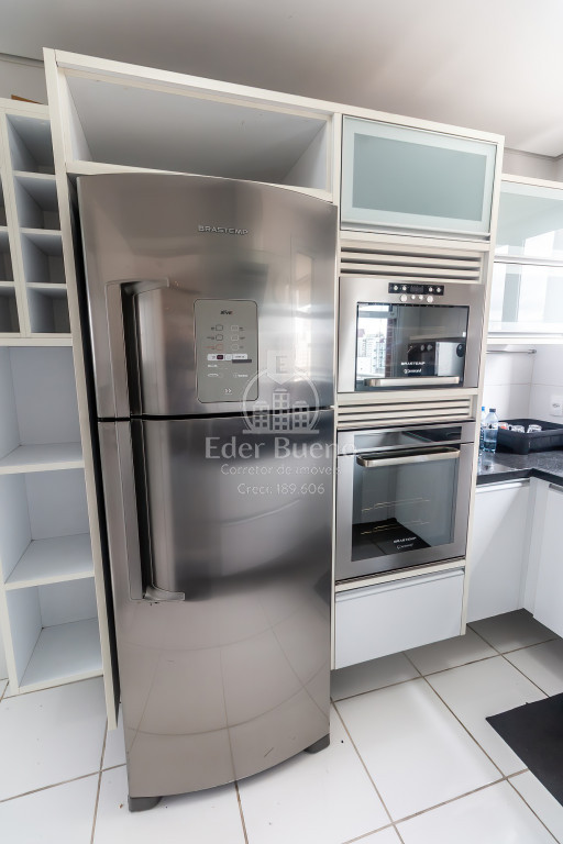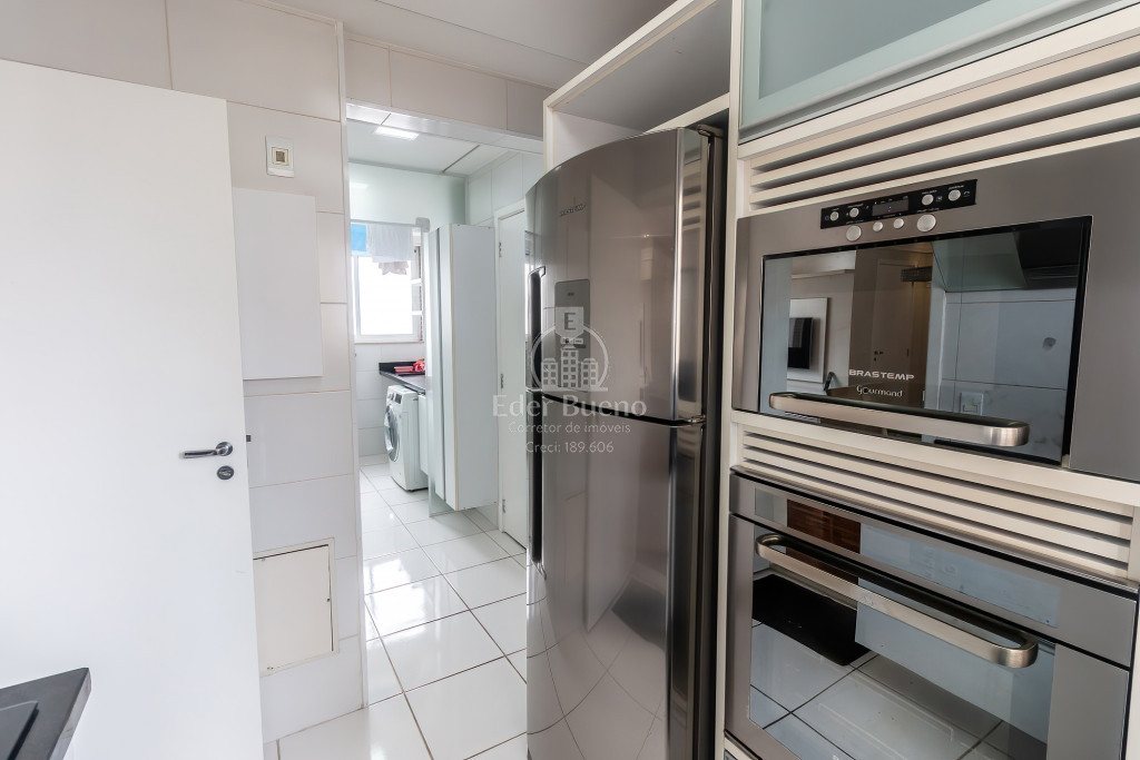 A cozinha é um convite à culinária gourmet, equipada com cooktop, coifa, geladeira, forno e microondas de